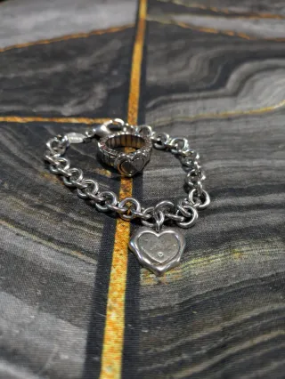 Conjunto de pulsera y anillo con diseño de corazón en acero - Pulsera de eslabones plateados. - Anillo con detalle de corazón. - Inscripción Love en los dijes. - Pequeño cristal en cada dije.