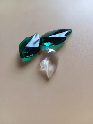 Conjunto de tres hojas decorativas de cristal. -precio por el conjunto - Dos hojas de color verde intenso. - Una hoja transparente. - Diseño facetado.