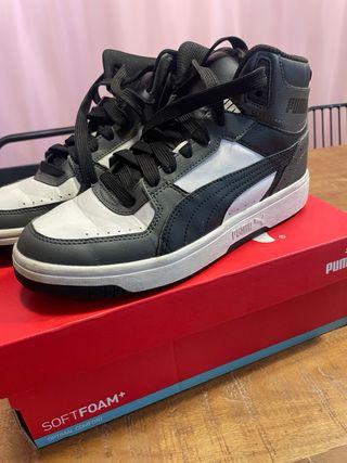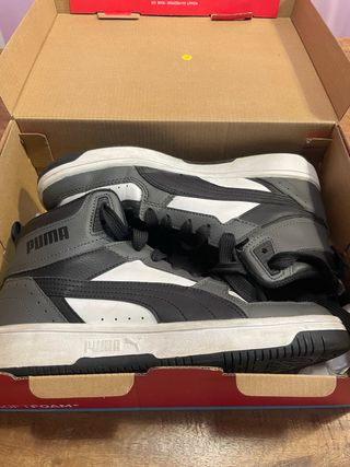Zapatillas altas Puma Rebound Joy para mujer. - Diseño moderno en negro y gris. - Cierre con cordones. - Suela de goma. - Logo de Puma en el lateral y la suela.