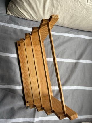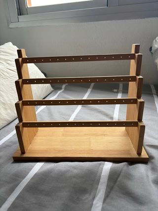 Expositor de madera para organizar joyas. - Cuatro niveles con múltiples orificios para pendientes. - Base amplia para mayor estabilidad. - Diseño natural y elegante.