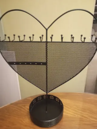 Este organizador de joyas tiene un diseño en forma de corazón. - Fabricado en metal. - Base circular decorada con motivos. - Múltiples ganchos para collares y pulseras. - Panel perforado para pendientes.