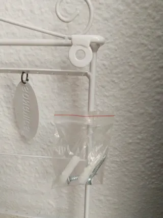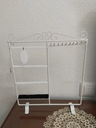 Elegante organizador de joyas con un diseño delicado y detalles ornamentales. - Estructura de metal con acabado blanco. - Parte superior con adornos curvos y un corazón central. - Múltiples niveles para colgar y exhibir accesorios. 👉 Se puede colgar en la pared.
