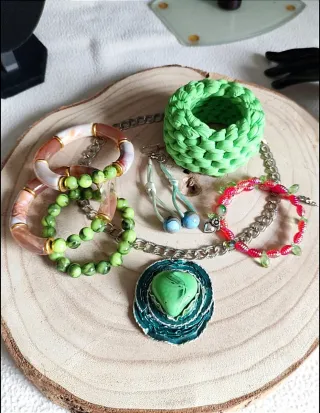 - Collar de carey hecho por artesana. - Dos pares de pendientes con cuentas acrílicas en forma de estrellas. - Anillo de alambre. - Dos pulseras hechas con vaqueros. - Una pulsera elástica hecha con cuentas acrílicas y conchas de mar.