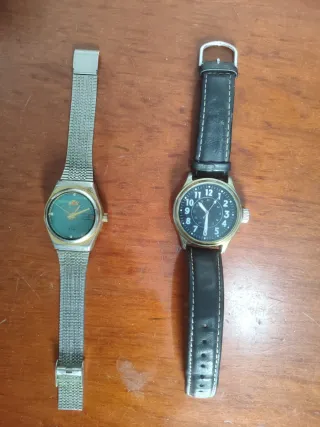 Se venden dos relojes, uno de la marca Oreintex y otro básico. - Reloj Oreintex con esfera verde y correa metálica Oreintex. 27 Jewels. Lo acabo de encontrar en el baúl de los recuerdos, no se cómo estará por dentro pero el botón para girar las agujas funciona bien.
