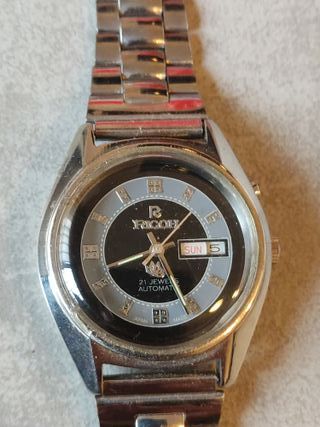 Reloj Ricoh automático vintage con 21 joyas. Un clásico para coleccionistas o para reparar. - Esfera negra y gris con detalles plateados. - Indicador de día y fecha. - Brazalete de metal. - Fabricado en Japón.