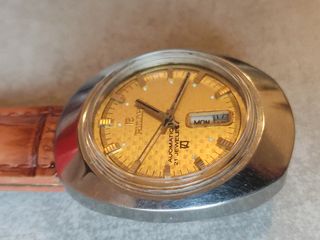 Reloj de pulsera Ricoh automático con una esfera dorada y correa de cuero marrón.Para reparar funciona pero se para . - Esfera con patrón texturizado. - Indicador de día y fecha. - Movimiento automático de 21 joyas. - Correa de cuero con acabado texturizado.