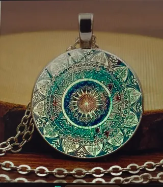 Collar con un bonito colgante con diseño de mandala. - Diseño circular con detalles intrincados. - Cadena plateada. - Estilo bohemio y étnico.