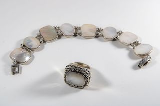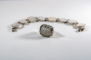 Medidas: Pulsera: 195 x 18 x 4 (an x p x al) mm y 30 g aprox. Anillo: 23 x 19 x 16 (an x p x al) mm, 9 g aprox, diámetro interior: 17,5 mm. Material: Plata de ley 925 y nácar ópalo blanco. Década: 70. Como nuevo.