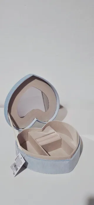 Precioso joyero con forma de corazón, perfecto para guardar tus joyas. - Interior forrado en terciopelo suave. - Compartimentos interiores para organizar anillos y otros accesorios. - Espejo integrado en la tapa.