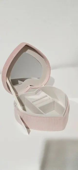 Precioso joyero con forma de corazón, perfecto para organizar tus joyas. - Diseño en forma de corazón. - Interior forrado para proteger tus accesorios. - Tapa con espejo.