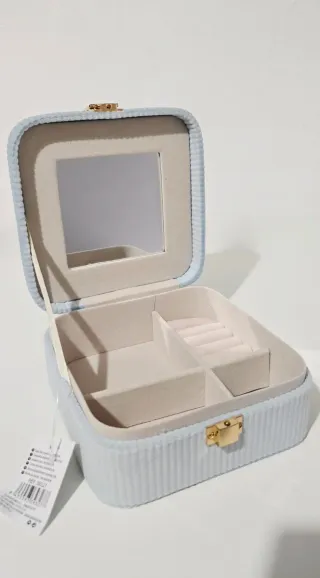 Elegante joyero para organizar tus accesorios. - Interior forrado en tela suave. - Compartimentos para anillos y otras joyas. - Espejo integrado en la tapa. - Cierre dorado.
