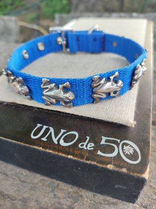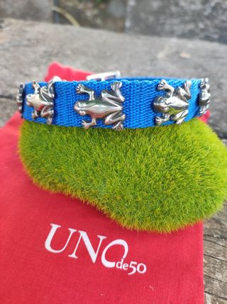 Collar para perro de la marca española Uno de 50 modelo vintage de nylon azul eléctrico con ranitas incrustadas de metal bañado en plata. Mide 38cms. y el último agujerito lo tiene a los 34cms. Envío a cargo del comprador. No se admiten devoluciones.