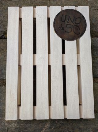 Expositor de la marca española Uno de 50 de madera teñida de blanco con forma de pequeño palet y parche redondo de cuero marrón con inscripción de la marca. Medidas: 30x40x3cms. No se admiten devoluciones. También puedes encontrar en mi armario los expositores pequeños de la tercera foto. Envío a cargo del comprador. No se admiten devoluciones.