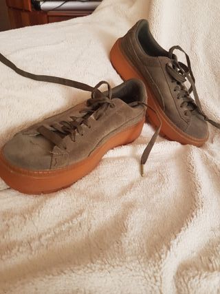 Zapatillas Puma Suede con algo de plataforma. Número 39. Color verde oscuro-caqui. Ya no se encuentran: modelo descatalogado: una joya. Precio original 120-140 euros. En plataformas de segunda mano no se encuentran por debajo de 30 eur.En perfecto estado (ver foto de las suelas). Muy poco usadas. Sólo puedo calzar deportivas clásicas.