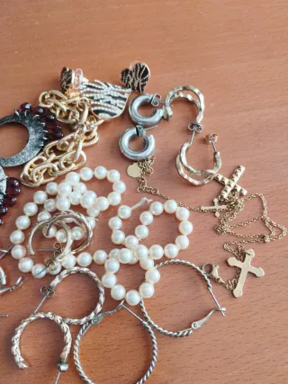 Lote de varias piezas de bisutería vintage. - Collar de cadena dorada. - Collar de perlas. - Pendientes de aro plateados. - Pendientes con diseño de cebra. - Colgante de cruz dorado. - Otros pendientes y colgantes variados.