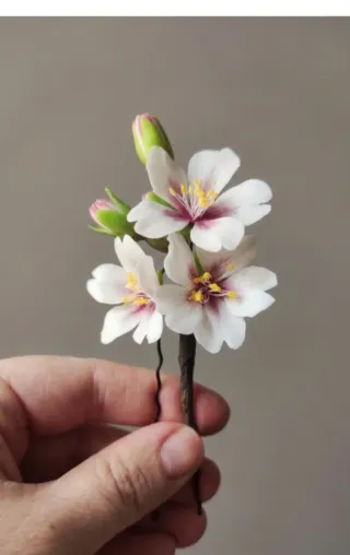Vendo este precioso tocado artesanal inspirado en la flor de Almendro. Es una pieza única, hecha totalmente a mano con un nivel de detalle increíble. A diferencia de las flores naturales, esta no se marchita y podrás conservarla como recuerdo para siempre. tocado artesanal con flores delicadas. - Flores de pétalos blancos con detalles rosados. - Capullos verdes a juego. - Ideal para eventos especiales.Características principales: Material: Porcelana fría / Pasta de flores de alta calidad (acabado muy ligero y resistente).
