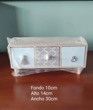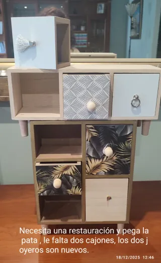 Joyero con varios compartimentos y cajones, ideal para organizar tus accesorios. - Necesita restauración y pegar una pata. - Le faltan dos cajones. - Los tiradores son nuevos.