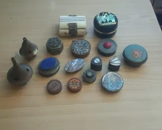 Conjunto de joyeros vintage con un diseño elegante y detallado. - Elaborados en madera y metal. - Decorados con incrustaciones y motivos. - Incluyen detalles ornamentales en la tapa.