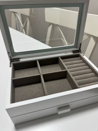 Elegante joyero de Zara Home, perfecto para organizar tus accesorios. - Diseño lacado en blanco. - Interior forrado en fieltro gris. - Compartimentos para anillos y otras joyas. - Cierre con tapa de cristal.
