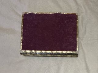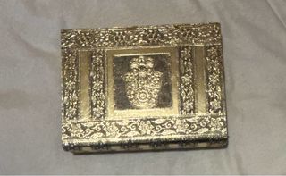 Elegante joyero con un diseño de la mano de fátima y detalles en relieve. - Acabado metálico dorado. - Decoración con motivos florales y un emblema central. - Estructura rectangular.