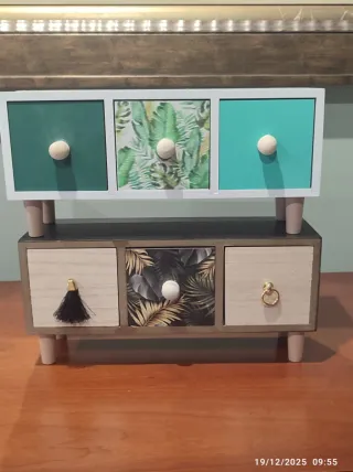 Joyero con diseño tropical, ideal para restaurar y personalizar. - Diseño con hojas tropicales. - Cajones de diferentes colores. - Un cajón está roto y necesita ser pegado.