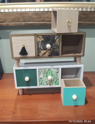 Conjunto de dos joyeros nuevos con un diseño elegante y moderno. Perfectos para organizar tus accesorios. - Diseño con motivos de hojas tropicales. - Tiradores variados para cada cajón. ( Todos los joyeros de mi perfil pueden tener algún defecto por ser de madera)