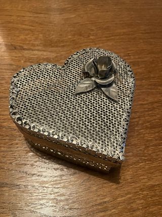Elegante caja joyero con forma de corazón, perfecta para guardar tus tesoros. Está ligeramente deformada por uno de los laterales como se ve en las fotografías, pero es muy poco apreciable. - Diseño vintage con detalles ornamentales. - Elaborada en metal con acabado plateado. - Decorada con una rosa y hojas en relieve.