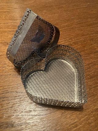 Bonita caja joyero con forma de corazón. Ideal para guardar tus pequeños tesoros. Está ligeramente deformada por uno de los laterales como se ve en las fotografías, pero es muy poco apreciable. - Diseño calado con detalles ornamentales. - Adorno floral en relieve en la tapa. - Material metálico.