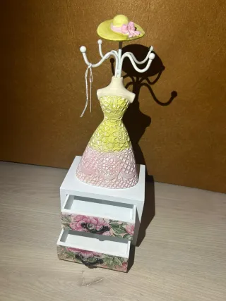 Original joyero con forma de maniquí y base de dos cajones. - Diseño de maniquí con vestido. - Base con dos cajones decorados con flores. - Ideal para guardar bisutería y pequeños accesorios. 2 modelos diferentes, precio unidad
