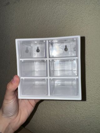 Pequeño joyero organizador con seis compartimentos transparentes. - Diseño compacto. - Ideal para bisutería y pequeños objetos. - Estructura blanca.