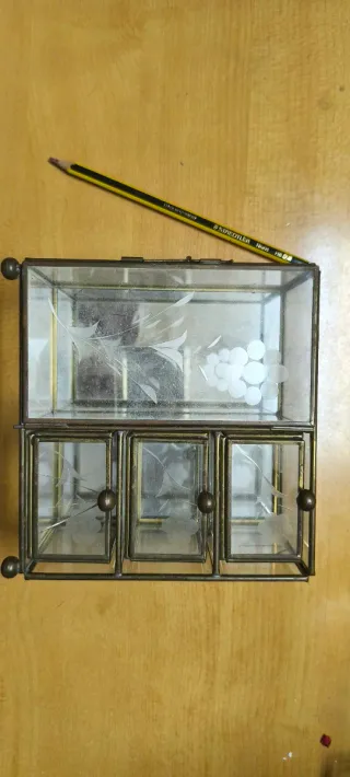 Elegante joyero de cristal con detalles grabados y estructura de latón. - Diseño con múltiples compartimentos. - Acabado en latón dorado. -El último cajón está rasgado el cristal,pero está unido