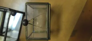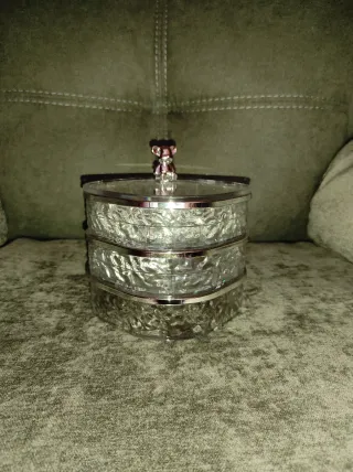 Pequeña caja joyero con un diseño floral de cristal. Ideal para guardar pequeños tesoros. - Tapa decorada con flores en tonos rosas, morados y verdes. - Borde metálico con detalles ornamentales. Altura-4 cm.,diámetro 4,5 cm.. - Base con un patrón de rejilla.
