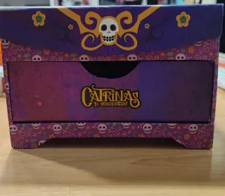 Bonito joyero con diseño de Catrinas y calaveritas. - Decoración con motivos florales y calaveras. - Cajón frontal con apertura. - Tonos morados y multicolores.
