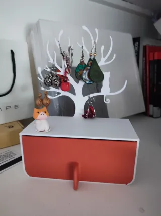 Original joyero con forma de mapache, ideal para organizar tus accesorios. - Diseño divertido y funcional. - Múltiples cajones para guardar joyas y pequeños objetos. - El brazo del mapache sirve para colgar collares.