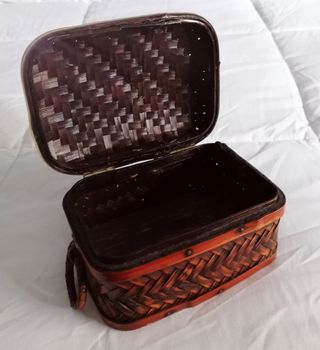 Elegante joyero artesanal con un diseño único. - Fabricado en mimbre y madera. - Detalles de tejido trenzado en la tapa. - Marco decorativo en la tapa.