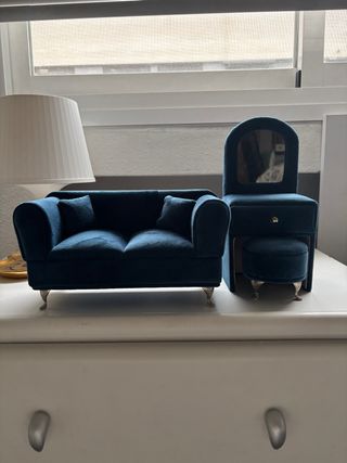 Este conjunto de joyeros incluye un sofá y un tocador con espejo y taburete. - Diseño elegante en terciopelo azul. - Detalles plateados en las patas. - Cajón con tirador de joya.