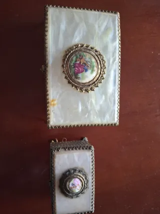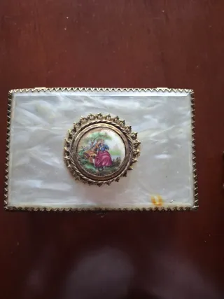 Elegante joyero de estilo antiguo, perfecto para guardar tus tesoros. - Diseño rectangular con detalles dorados. - Adorno central con escena pintada. - Acabado nacarado. El grande necesita arreglo pero el pequeño esta perfecto. Vendo los doa junto.