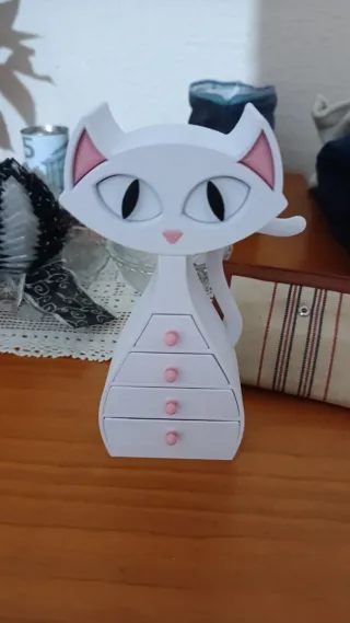 Original joyero con forma de gato, ideal para guardar tus accesorios. - Diseño estilizado en blanco con detalles en rosa. - Cuerpo con cuatro cajones pequeños. - Tiradores redondos en color rosa.