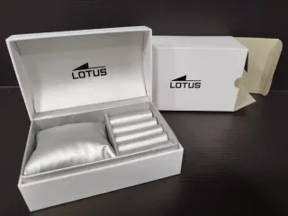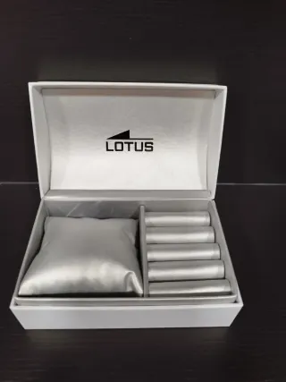 Caja joyero de la marca Lotus. - Interior forrado en tela plateada. - Compartimento para reloj o pulsera. - Divisiones para anillos y otros accesorios. Medidas: ancho 14 - fondo 9 - alto 6'5
