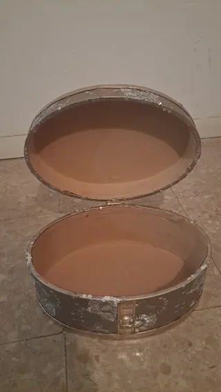 Elegante joyero vintage de forma ovalada, adornado con un delicado diseño de lentejuelas. - Acabado en tono gris y plateado. - Asa superior para facilitar su transporte. - Cierre frontal con correa y hebilla. Medidas aprox. - Alto 15 cm. - Ancho 30 cm.