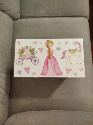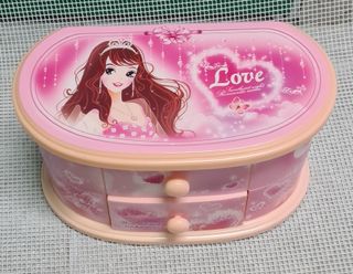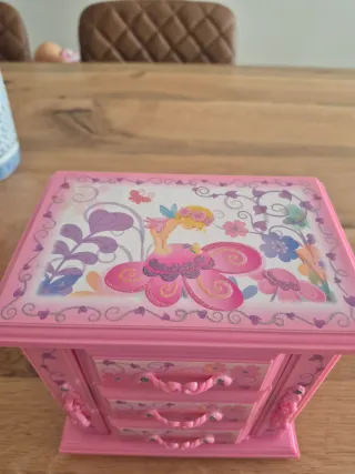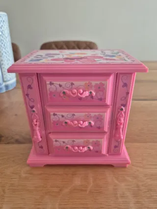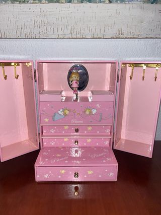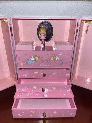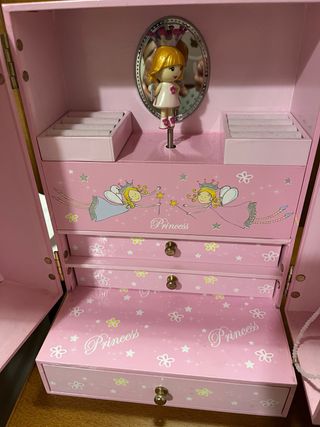 Precioso joyero musical con diseño de princesas. - Figura de bailarina giratoria. - Espejo ovalado. - Varios compartimentos para guardar joyas. - Cajones con tiradores. - Decoración de estrellas y flores.