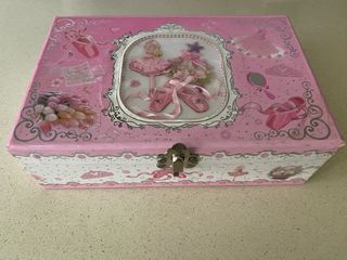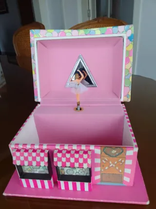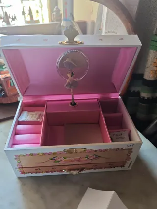 Precioso joyero musical con un diseño encantador de bailarinas. Tiene marcas de uso - Decorado con bailarinas de ballet. - Incluye un cajón. - Tiradores decorativos.