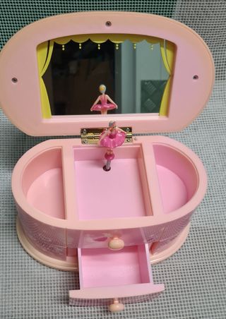 Bonita cajita de música para niñas con una figura de bailarina. - Diseño ovalado. - Compartimentos interiores para guardar joyas. - Espejo en la tapa. - Cajón extraíble con tirador. Artículo NUEVO, procede de cierre de tienda