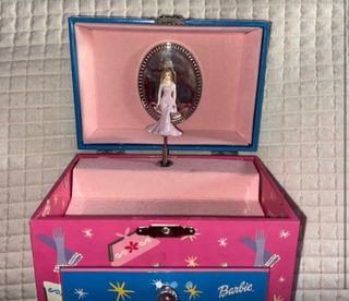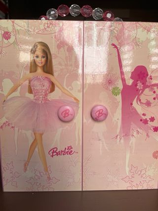 Precioso joyero tio maletín musical de Barbie - Diseño en forma de maletín. - Espejo en forma de flor. - Incluye una figura de bailarina. - Varios compartimentos y cajones para guardar joyas. - Decorado con motivos florales y de ballet.