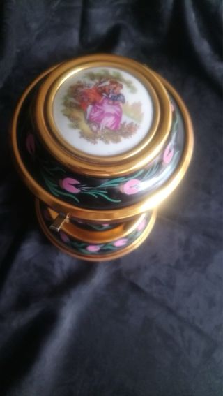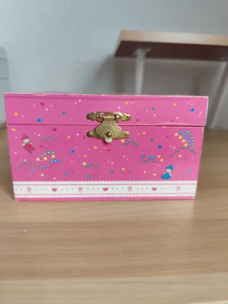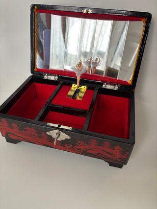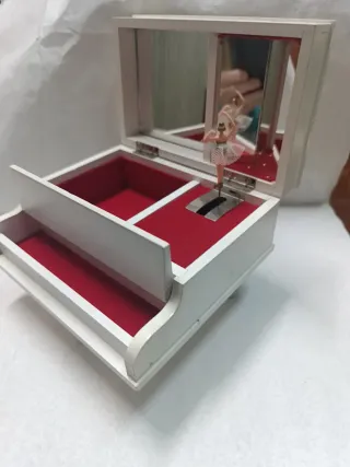 Bonito joyero con forma de cajita de música. - Interior forrado en terciopelo rojo. - Espejo interior. - Figura de bailarina. - La música a cuerda suena perfectamente.