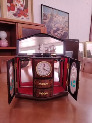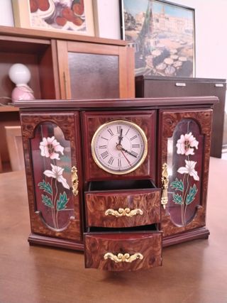 Elegante joyero con un reloj integrado y detalles decorativos. -No es de madera -la bailarina no da vueltas , pero se puede arreglar. - Frontales con adornos florales. - Tiradores dorados en los cajones. - el reloj funciona perfectamente.