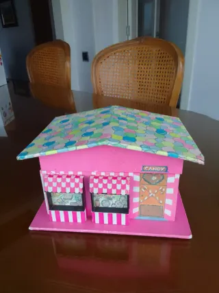 Encantadora caja de música con diseño de joyero y una figura de bailarina. - Decorada con motivos de tiendas y un espejo triangular. - Interior forrado en tela rosa.