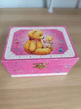 Joyero músical en color rosa con bailarina - Decorada con ositos - Tiene un cierre de metal dorado. - Del año 1998 + Medidas 15x10x8 aprox