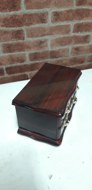 Elegante joyero musical de estilo vintage, con un diseño clásico y acabados cuidados. - 18cm alto×26cm ancho×13cm fondo - Compartimentos interiores forrados en terciopelo rojo. - Cajones con tiradores dorados. - Espejo integrado en la tapa. - Figura de bailarina.(si le das cuerda al abrir suena música y la bailarina da vueltas)