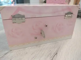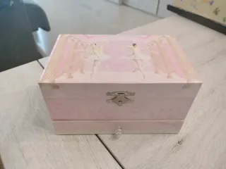 Preciosa cajita de música con una figura de bailarina giratoria. Ideal para guardar pequeños tesoros. - No contiene llave para cerrarla! - Interior forrado en tela rosa. - Espejo en la tapa. - Mecanismo musical.